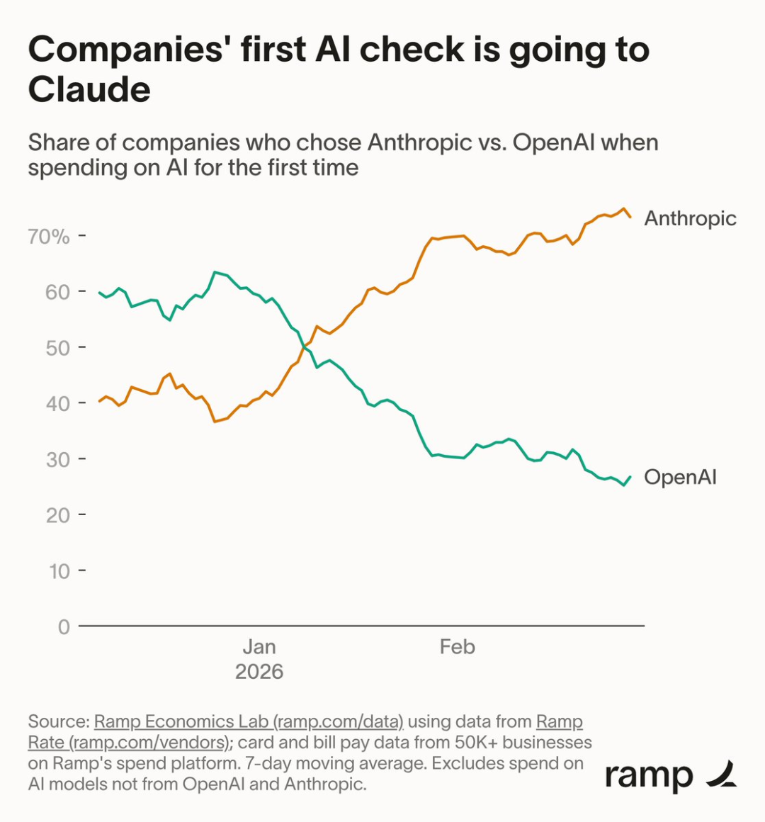 据最新Ramp AI指数清爽,Anthropic已卓绝OpenAI,成为好意思国企业的首选。
