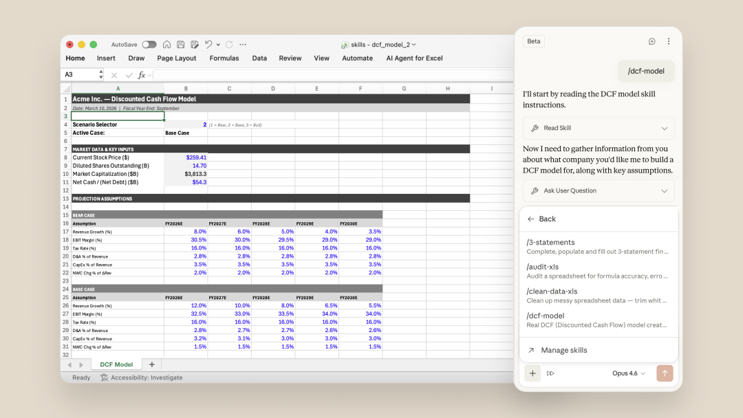 Claude此次更新还预置了包括财务模子审计、DCF模板构建、PPT逻辑润色等专科手段。